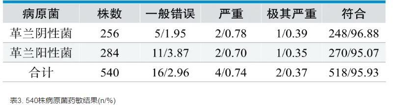 革兰阴性菌药敏结果相符248株,符合率为96.88%。革兰阳性菌药敏结果相符270株,符合率为95.07%。总体相符518株,符合率为95.93%,具体情况见表3。