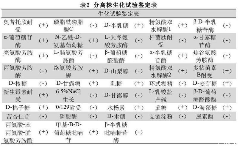 经43种生化试验,分离菌株符合猪链球菌的生化培养特性,鉴定为猪链球菌(见表2)。