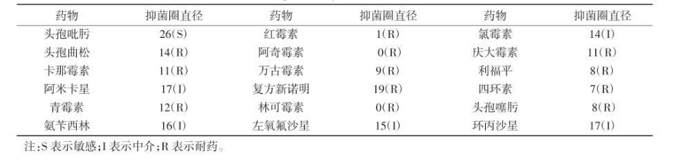 18种药品对PM-XNR进行药敏试验,其中该菌株PM-XNR对头孢抗生素头孢吡肟敏感,对阿米卡星、氨苄西林、左氧氟沙星、氯霉素和环丙沙星中度敏感;对其他使用的抗生素均耐药。说明犬源奇异变形杆菌具有较强的耐药性。