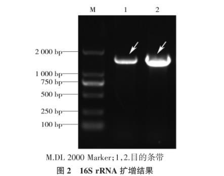 参考细菌基因组提取试剂盒说明书提取细菌基因组DNA,稀释至浓度为20 ng·μL-1备用。设计细菌16S通用引物,引物序列为F5′-GAGTTTGATCCTGGCTCA-3′和R5′-GTTACCTTGTTACGACT-3′,预扩增片段大小约为1 500 bp。PCR扩增体系(总体积为50μL):Rnase-free 2×Taq Mix 25μL,引物各2μL,DNA模板2μL,H2O 19μL。扩增程序:94℃预变性90 s;94℃变性20 s,50℃退火20 s,72℃延伸90 s,30个循环;72℃再延伸5 min。使用DNA纯化回收试剂盒切胶纯化PCR产物,琼脂糖凝胶电泳观察条带大小无误后送到生工生物工程(上海)股份有限公司测序。测序结果与GenBank中其他序列进行比对分析。