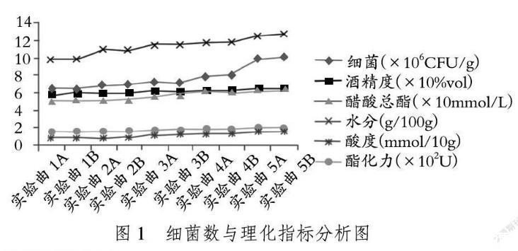 由图1可知,随着实验曲细菌数量的增加,实验曲中所含水分的量也要增加。因为,细菌数量越多,所需的水分便越多。同时,随着实验曲细菌数量的增加,酒曲的理化指标酸度和酯化力、原浆酒的理化指标酸酯总量和酒精度都是随着实验曲的细菌数量的增加而增加的。