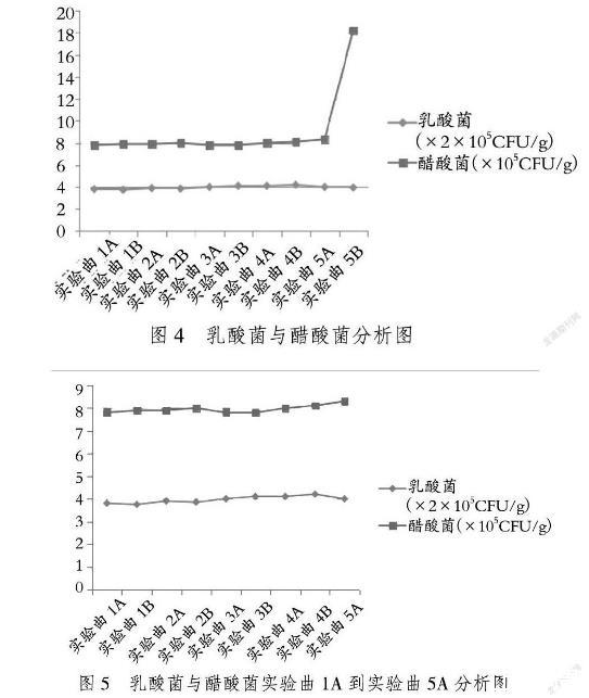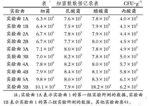 由表可知,实验曲1、实验曲2、实验曲3、实验曲4和实验曲5的细菌数依次递增,丙酸菌数也是依次递增的。实验曲1、实验曲2和实验曲3的乳酸菌数是依次递增,实验曲3、实验曲4和实验曲5的乳酸菌数是依次递减的。实验曲1、实验曲2乳酸菌的数量相对于实验曲3、实验曲4和实验曲5较少。