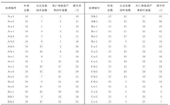 注:为方便统计,表中所述长出发根的叶盘数是指凡是叶盘边缘长出了根的叶盘的数量,这些根不一定是发根,因此,诱导率也并不一定是阳性诱导率;死亡和染菌严重的叶盘数指培养过程中黄化死亡未能长出发根的,及虽长出了发根但染菌严重,无法脱菌完全的叶盘总数。