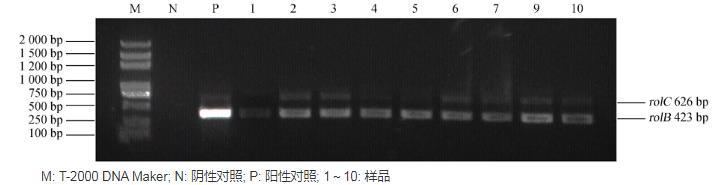 按上述发根鉴定方法对脱菌完全的发根提取DNA进行PCR鉴定,其中对照组绝大部分在除菌筛选培养时已黄化死亡,少数存活的不定根PCR鉴定也均不含rolB、rolC基因,因此不是发根。试验组则大部分是有rolB、rolC基因的阳性发根。PCR鉴定结果如图2。阳性发根则于液体培养基中扩大培养。