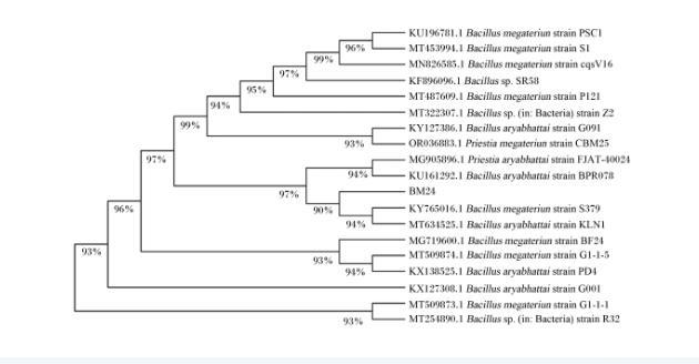 分离菌株16S rRNA基因扩增产物片段大小约为1 500 bp(图2),PCR扩增产物测序后结果制作进化树(图3),分离菌株序列与NCBI上已发布的巨大芽孢杆菌基因组序列同源相似性均在90%以上,因此确定该分离菌株为巨大芽孢杆菌,将其命名为巨大芽孢杆菌BM24。