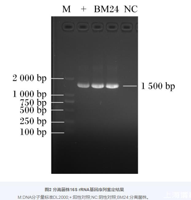 图2分离菌株16S rRNA基因序列鉴定结果M:DNA分子量标准DL2000;+:阳性对照;NC:阴性对照;BM24:分离菌株。