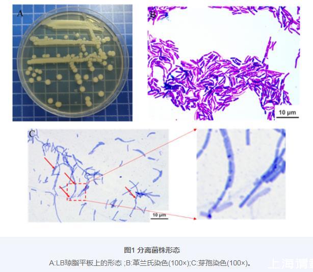 分离菌株在LB琼脂培养基上培养后单菌落呈淡黄色圆形或椭圆形,微凸起,不透明,表面光滑,边缘整齐(图1-A);革兰氏染色结果显示该菌株为革兰氏阳性杆状细菌(图1-B);芽孢染色可见内生孢子(图1-C)。
