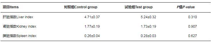 由图8可知,试验期间2组小鼠的体重无显著差异(P>0.05);从表4可知,与对照组相比,试验组小鼠肝脏、肾脏、脾脏指数均无显著变化(P>0.05)。