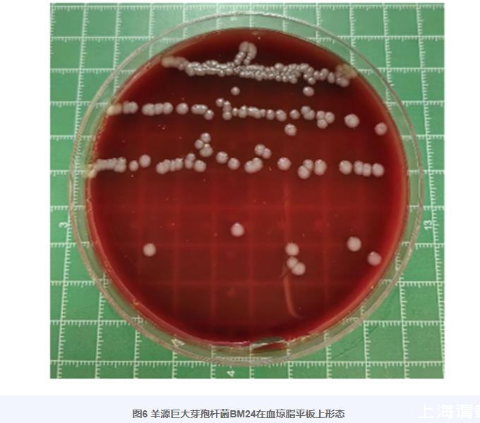 如图6所示,羊源巨大芽孢杆菌BM24在绵羊血平板上生长良好,菌落周围无溶血环,表明其无溶血活性。