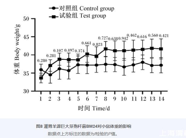 图8灌胃羊源巨大芽孢杆菌BM24对小鼠体重的影响数据点上方标注的数据为t检验的P值。