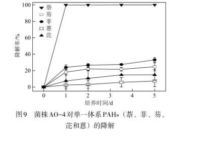 图9菌株AO-4对单一体系PAHs(萘、菲、芴、芘和蒽)的降解