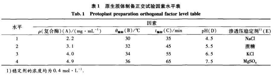 表1原生质体制备正交试验因素水平表
