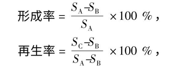 式中,SA、SB、SC分别为PDA培养基、低渗培养基、双层再生培养基上的菌落面积(cm2)。
