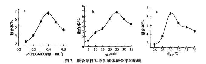 由图3c可以看出,随着融合温度的增加,原生质体融合率先增加后降低。当融合温度为30℃时,原生质体融合率为6.452%.原因可能是融合温度低时达不到融合条件,融合温度高时抑制PEG6000作用,致使原生质体融合率降低。