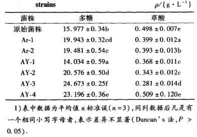 本试验中采用紫外照射和热处理方法灭活双亲原生质体,但紫外处理和热处理在一定条件下有可逆性,因此融合培养后的菌株具有不稳定性,其性状特征可能很快失去,所以必须传代数次保证其性状的稳定性。另外在发酵过程中发现,伴随多糖的产生,会生成草酸,使发酵液pH由4.55很快降至2.00左右,从而抑制了多糖的分泌,当草酸产量高于0.368 g·L——1时,多糖产量就会受到影响。采用原生质体融合技术选育出的菌株AY-3满足了草酸低产,多糖高产的要求。