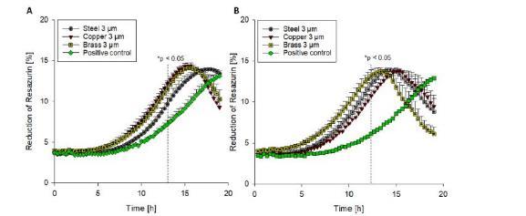 图5、与结构化(3μm)铜、黄铜和钢以及未经处理的孢子接触后,孢子生长和发芽过程中代谢活性的发育,没有任何金属表面接触。代谢活性测量为A)A.niger野生型N402孢子和B)A.niger色素沉着突变菌株(MA 93.1)与3μm USP-DLIP功能化表面接触120分钟后刃天青(%)的相应减少。将阳性对照的代谢速率与处理过的孢子进行比较,观察到以下显着性:A)钢3μm(p=0.010)、铜3μm(p=0.0007)和黄铜3μm(p=0.0006)。数据显示为平均值±标准误差(n=3)。值得注意的是,在野生型孢子(p=0.03)的12小时时观察到钢和铜表面之间的特异性显着差异,尽管由于随着时间的推移重叠的代谢趋势,这种差异很难可视化。B)钢3μm(p=0.006),铜3μm(p=0.010)和黄铜3μm(p=0.004)。