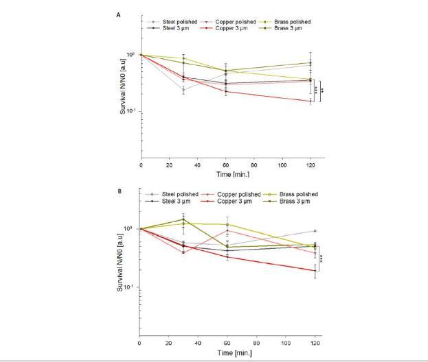 图4、A)A.niger野生型N402孢子和B)A.niger色素沉着突变菌株(MA 93.1)在与相应的功能化表面接触30、60和120分钟后的存活数据。存活分数(N/N0)是相对于未暴露的孢子计算的(与金属表面没有任何接触的初始孢子浓度)。