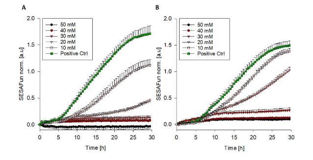 图3、以SESAfun规范[a.u].对应于A)野生型菌株和B)色素沉着突变菌株随时间变化的真菌质量。阳性(未处理的)真菌孢子显示为绿色。