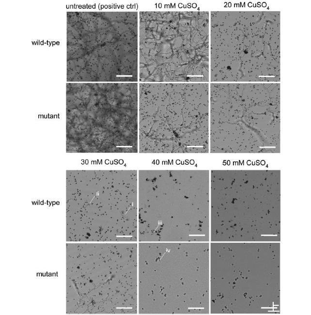 图2、在30°C(终点)下孵育30小时后,所有测试的CuSO4浓度(10×10、20×10、30×10、40×10、50×10m)以及两种菌株的未处理对照。比例尺对应于50μm