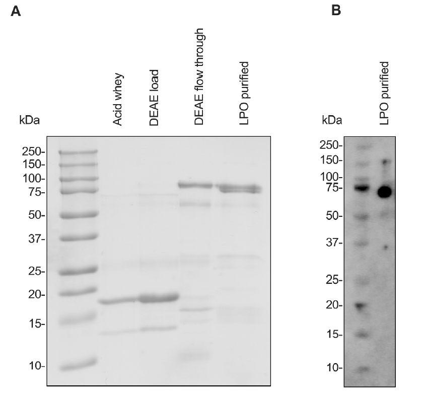 图2、乳过氧化物酶(LPO)的分离。(A)在LPO分离过程中,对选定的馏分进行十二烷基硫酸钠-聚丙烯酰胺凝胶电泳,从酸性乳清通过二乙氨基乙基(DEAE)琼脂糖凝胶阴离子交换柱,最终得到LPO分离物。(B)分离的LPO的Western blot分析。