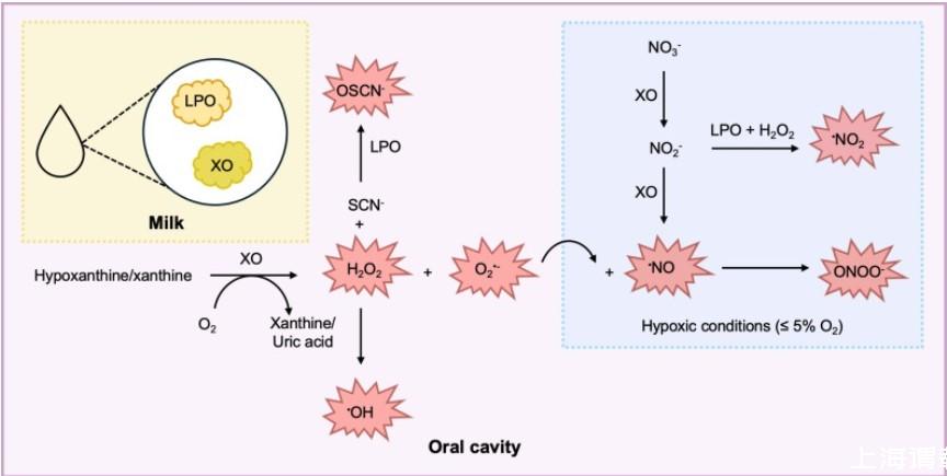 图1、牛奶和口腔之间拟议的黄嘌呤氧化酶(XO)-乳过氧化物酶(LPO)系统概述。在母乳喂养期间,乳源性XO和LPO会在口腔中遇到它们的底物次黄嘌呤/黄嘌呤和硫氰酸盐(SCN-)。XO-LPO系统可以产生一系列抗菌活性氧和氮物质(标记为红色),例如过氧化氢(H2O2)、超氧化物(O2-)、次硫氰酸盐(OSCN-)、二氧化氮(NO2)、氮氧化物(NO)和过氧亚硝酸盐(ONOO–)。