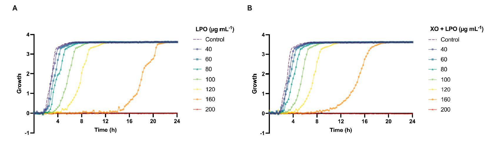 图3、添加乳过氧化物酶(LPO)(A)或黄嘌呤氧化酶(XO)与LPO(B)联合的细菌生长曲线。显示了牛奶酶(0-200μg mL-1)对婴儿口腔过夜培养的细菌生长的剂量依赖性抗菌作用。使用oCelloScope在37°C下每15分钟监测一次细菌生长24小时。数据表示为基于一式三份的平均值。