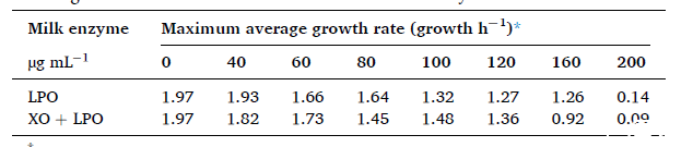 图5、乳过氧化物酶(LPO)和LPO联合黄嘌呤氧化酶(XO)对婴儿口腔培养细菌生长的影响。使用oCelloScope微生物动态监测系统评估不同浓度的LPO和LPO联合XO对婴儿口腔培养的细菌的影响。生长曲线数据被转换为最大平均增长率。单独添加LPO或与XO联合使用,均显示出剂量依赖性抗菌作用。其中在较低浓度(40–80μg mL-1)下,酶导致滞后期略有延长,生长速率略有降低。在中等浓度(100–160μg mL-1)下,滞后期显著延长,生长速率显著降低。在最高测试浓度(200μg mL-1)下,细菌生长受到完全抑制。