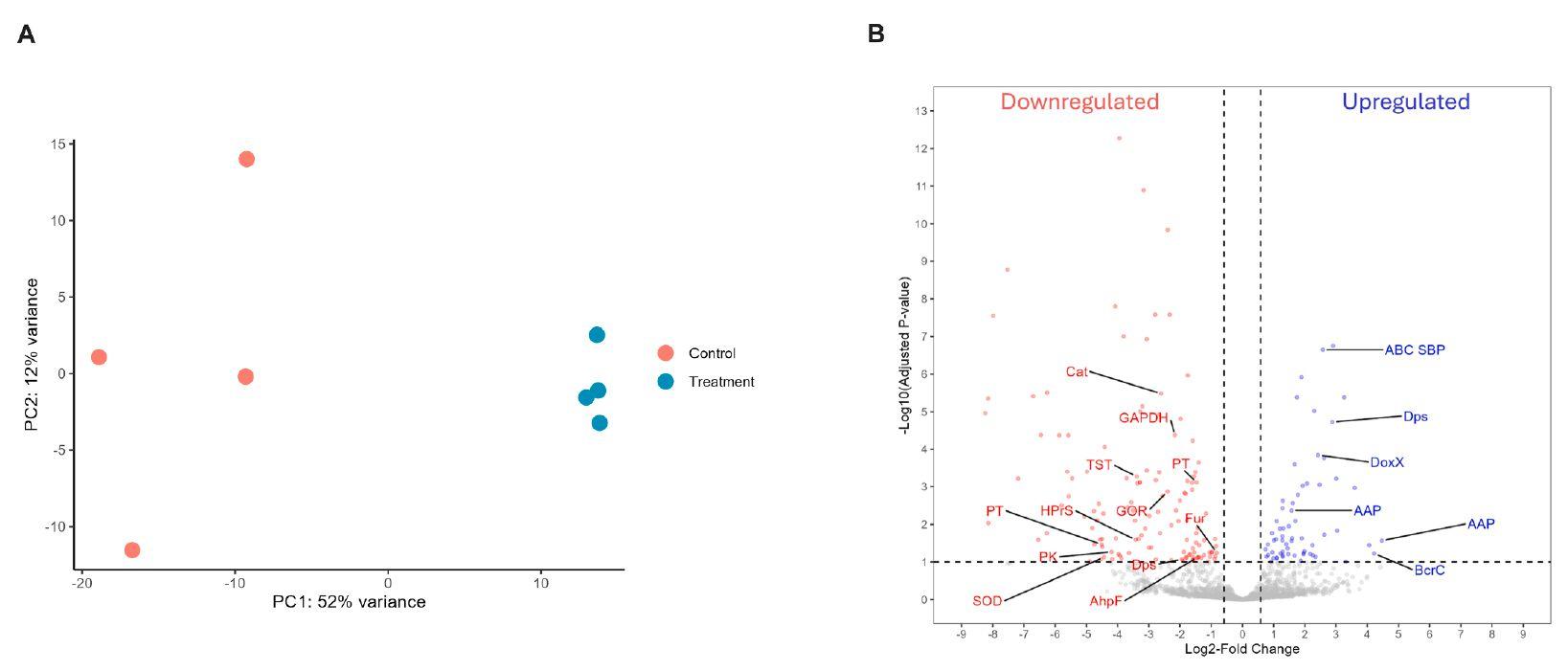 图4、从婴儿口腔培养的细菌中的基因表达分析。(A)基于转录组学数据的基因表达主成分分析。(B)火山图显示对照和处理之间差异表达的基因(黄嘌呤氧化酶-乳过氧化物酶,80μg mL-1)。红点代表显著下调的基因,蓝点代表显著上调的基因。水平虚线表示调整后的p值=0.1的截止值。调整后的p值是使用Benjamini-Hochberg过程计算的,并针对多个检验调整p值。垂直线表示基因表达的log2Fold变化的临界值±0.585,等于表达的1.5倍变化。