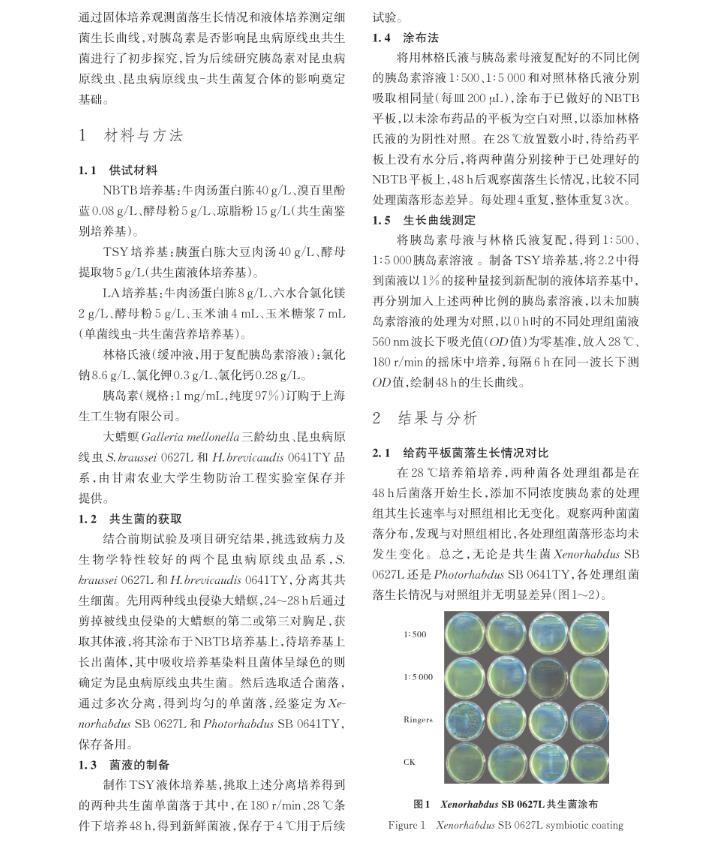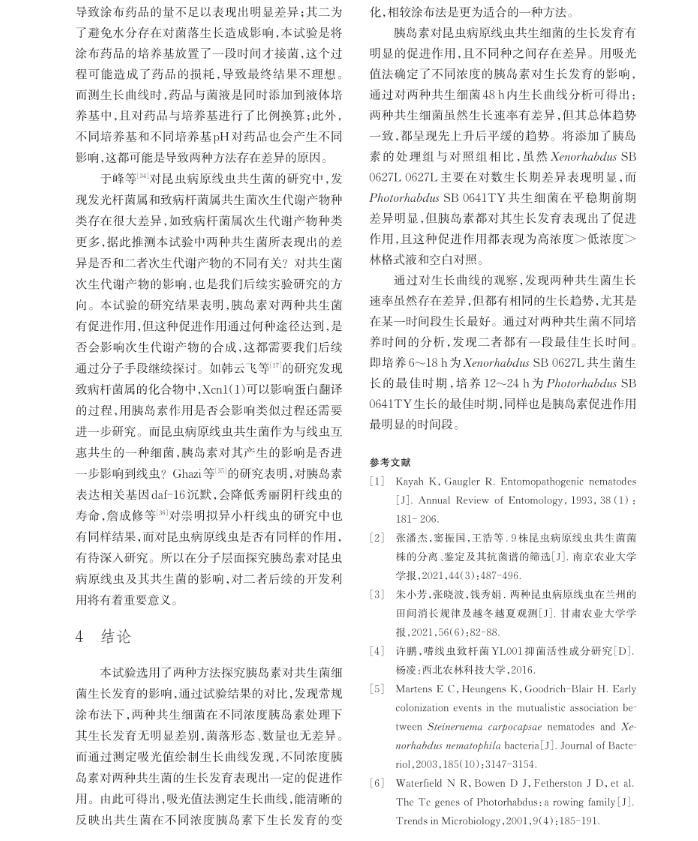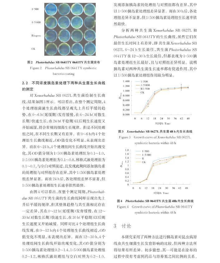 【方法】通过固体培养观测菌落生长和液体培养测定细菌生长曲线,探究胰岛素对昆虫病原线虫共生菌生长发育的影响,从而为进一步研究胰岛素对昆虫病原线虫及其共生菌生长发育的影响提供理论依据和技术支持。