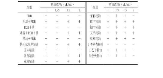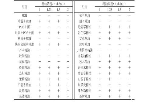 注:25种精油均为精油+吐温+PDB+皮落青霉;+.有菌丝生长;-.无菌丝生长。下同。