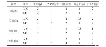 表3 5种植物精油对4种致病菌的MIC和MFC