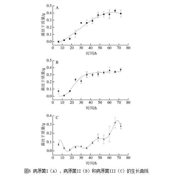 图5病原菌I(A)、病原菌II(B)和病原菌III(C)的生长曲线