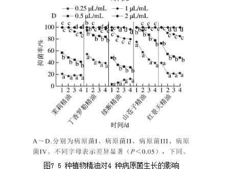 图7 5种植物精油对4种病原菌生长的影响