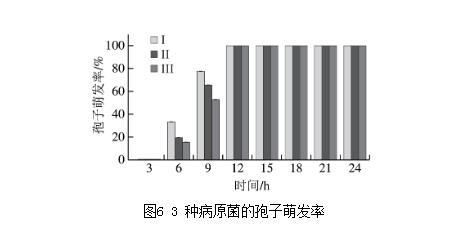如图6所示,3种病原菌在培养6 h时均已萌发,其中病原菌I的孢子萌发率最高(33%),病原菌II次之(19.67%),病原菌III最低(15.59%)。随着培养时间的延长,3种病原菌的孢子萌发率持续增加,且均在12 h完全萌发。