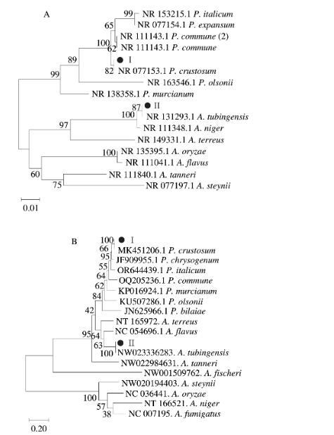 病原菌II菌丝为白色,壁厚且光滑,顶部形成球形顶囊,顶囊上覆盖一层梗基和小梗,分生孢子由小梗上产出。分生孢子为黑褐色,呈圆形或近圆形,直径为4μm左右。在PDA培养基上最先蔓延的是一层微乳白的分泌物,产孢量高,正面质地为绒状,颜色为黑褐色或者棕褐色,背面白色或微黄。侵染蓝莓后蓝莓果肉软腐,有黑色霉层覆盖并伴随汁液流出,根据其形态特征与曲霉属中的黑曲霉相似,推测病原菌II为曲霉属真菌。