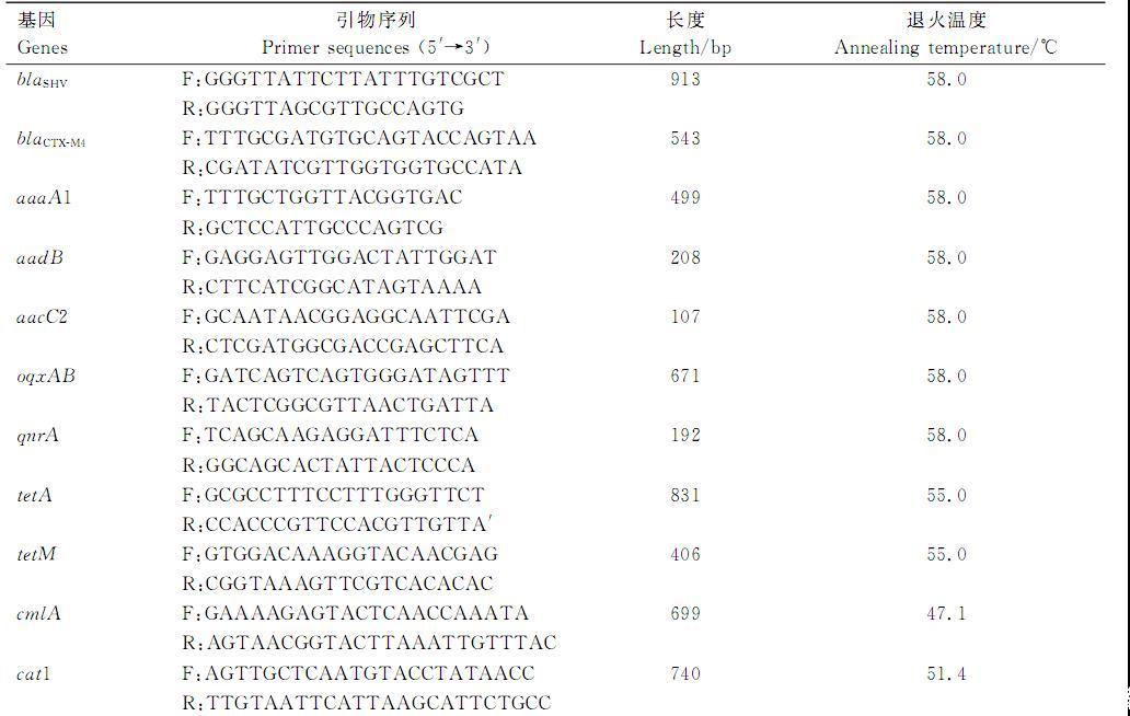 参考文献合成肺炎克雷伯菌5大类11种耐药基因引物,PCR反应体系及程序同1.5,退火温度见表2.PCR扩增产物进行1.0%琼脂糖凝胶电泳检测。