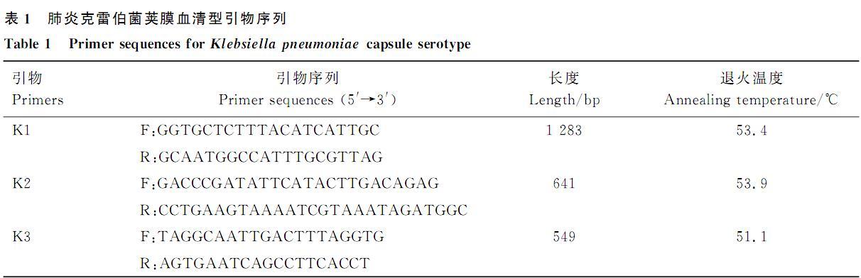 参考解秀梅等研究合成肺炎克雷伯菌7种常见荚膜血清型引物,PCR反应体系及程序同1.5,退火温度见表1.PCR扩增产物通过1.0%琼脂糖凝胶电泳检测。
