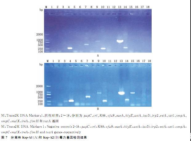 图7分离株Ksp-A1(A)和Ksp-A2(B)毒力基因检测结果