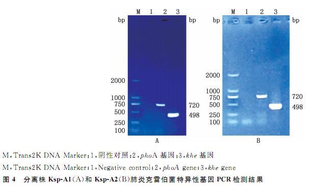 对分离株Ksp-A1和Ksp-A2进行PCR扩增,检测其是否含有肠杆菌科特异性基因phoA与肺炎克雷伯菌特异性基因khe,1.0%琼脂糖凝胶电泳检测结果显示,分别获得大小为720和498bp条带(图4),条带大小符合预期,因此判断2株分离株均为肠杆菌科肺炎克雷伯菌。