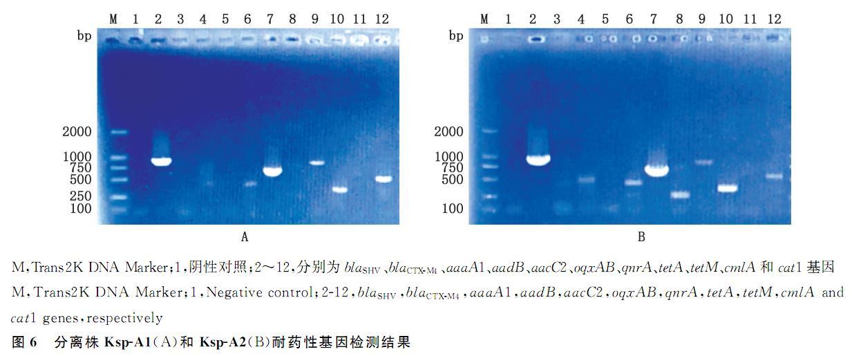 使用PCR检测分离株耐药基因,1.0%琼脂糖凝胶电泳检测结果显示,分离株Ksp-A1携带blaSHV、aacC2、oqxAB、tetA、tetM和cat16种耐药基因;分离株Ksp-A2携带blaSHV、aaaA1、aacC2、oqxAB、qnrA、tetA、tetM和cat18种耐药基因(图6)。
