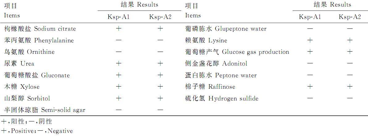 结果显示,2株分离菌株苯丙氨酸、鸟氨酸、半固体琼脂、葡磷胨水、侧金盏花醇、硫化氢和蛋白胨水试验均呈阴性,均能分解木糖、山梨醇、棉子糖,枸橼酸钠、尿素、葡萄糖酸盐、赖氨酸和葡萄糖产气反应呈阳性(表4),参照肠杆菌科细菌生化反应阳性率表,符合肺炎克雷伯菌生化特性。