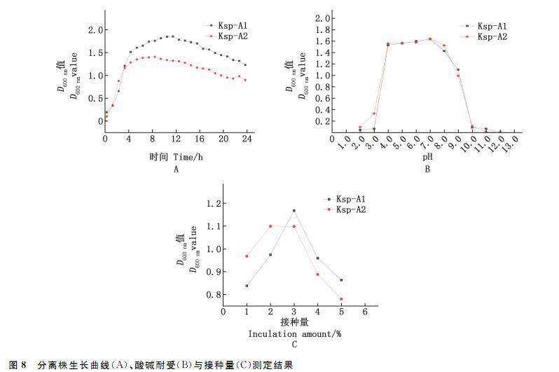 由图8B可知,分离株Ksp-A1、Ksp-A2在pH2.0-10.0均能存活,且pH为7.0时活性最好;当pH<2.0和pH>11.0时分离株Ksp-A1基本失去活性;当pH<2.0和pH>12.0时分离株Ksp-A2基本失去活性。