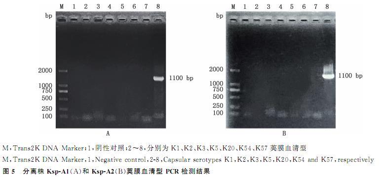 图5分离株Ksp-A1(A)和Ksp-A2(B)荚膜血清型PCR检测结果