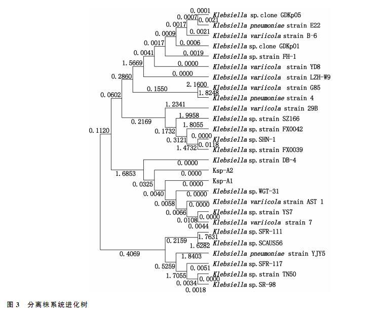 利用细菌16SrDNA通用引物对分离菌株进行PCR扩增,结果显示,获得大小约1490bp的片段(图2),大小与预期相符。测序结果BLAST比对显示,2株分离菌株与肺炎克雷伯菌的相似性达到99.50%-99.93%.系统进化树结果显示,分离株均与肺炎克雷伯菌DB-4、WGT-31株属于同一进化分支(图3),进一步证明2株分离株为肺炎克雷伯菌。