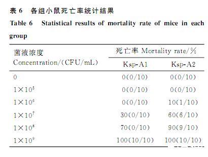 试验组小鼠在12h后开始发病,均出现被毛粗乱、精神沉郁、呼吸困难、腹泻等症状。对照组小鼠试验期间活动正常,未见异常。当分离株Ksp-A1和Ksp-A2菌液浓度为0和1×105CFU/mL时,小鼠死亡率均为0;当菌液浓度为1×106CFU/mL时,Ksp-A1组小鼠死亡率为0,Ksp-A2组小鼠死亡率为10%;当菌液浓度为1×107CFU/mL时,Ksp-A1组小鼠死亡率为30%,Ksp-A2组小鼠死亡率为60%;当菌液浓度为1×108CFU/mL时,Ksp-A1组小鼠死亡率为70%,Ksp-A2组小鼠死亡率为90%;当菌液浓度为1×109CFU/mL时,Ksp-A1和Ksp-A2组小鼠死亡率均达到100%(表6)。经计算得出,分离株Ksp-A1和Ksp-A2对小鼠的LD50分别为3.3×107和2.6×106CFU.