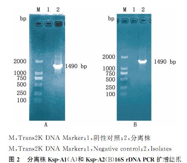 图2分离株Ksp-A1(A)和Ksp-A2(B)16SrDNAPCR扩增结果