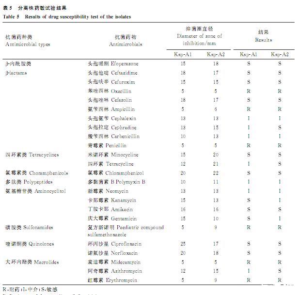 由表5可知,分离株Ksp-A1和Ksp-A2均对苯唑西林、氨苄西林、青霉素、复方新诺明、麦迪霉素和红霉素表现耐药,对头孢哌酮、头孢他啶、头孢呋辛、头孢唑啉、米诺环素、氯霉素、丁胺卡那、环丙沙星和诺氟沙星表现敏感,对头孢氨苄、羧苄西林、多黏菌素B和新霉素表现中介。Ksp-A1对头孢拉定、四环素和阿奇霉素表现中介,Ksp-A2对以上抗菌药表现敏感;Ksp-A2对卡那霉素和庆大霉素表现中介,Ksp-A1对其表现敏感。