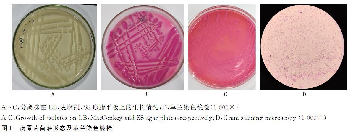 从8份腹泻鹌鹑粪样中成功分离到2株疑似菌落,其在LB琼脂培养基上生长为表面光滑湿润、边缘整齐、形状大而圆的灰白色菌落(图1A);在麦康凯琼脂培养基上生长为表面光滑湿润、边缘整齐,形状小而圆的粉色菌落(图1B);在SS琼脂板上生长为表面光滑湿润、边缘整齐的淡粉色菌落(图1C),在各培养基上均为黏稠状聚在一起,均伴有臭味。革兰染色镜检呈两端钝而圆的红色短杆状菌落(图1D),根据菌株形态可初步判断2株分离株为肺炎克雷伯菌,分别命名为Ksp-A1和Ksp-A2.A-C,分离株在LB、麦康凯、SS琼脂平板上的生长情况;D,革兰染色镜检(1000×)