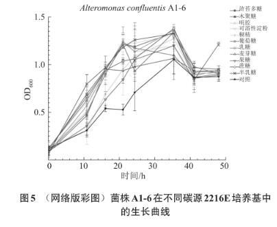 菌株Alteromonas Confluentis A1-6在不同碳源2216E培养基中的生长曲线如图5所示。与对照组相比,交替单胞菌Alteromonas confluentis A1-6除了在明胶和果糖中无明显生长外,其他碳源中都有生长,说明交替单胞菌A1-6对碳源的利用较黄杆菌S7更具有广谱性。其中对浒苔多糖、半乳糖和糊精的利用最明显,以这些碳源作底物,菌体的生长情况较其他糖类物质作底物时更好。菌株A1-6不能利用明胶和果糖,可以利用葡萄糖、浒苔多糖、半乳糖、乳糖、木聚糖、蔗糖、可溶性淀粉、麦芽糖和糊精。