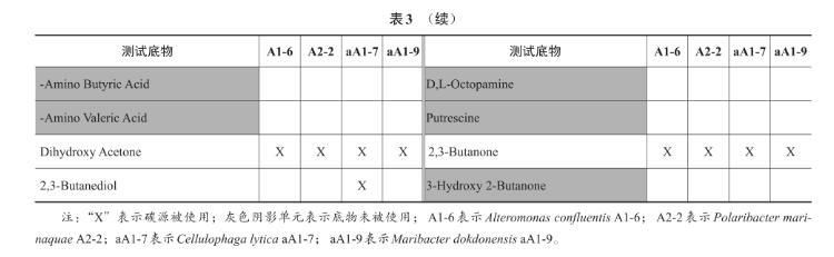 用BIOLOG对Alteromonas confluentis A1-6及3株黄杆菌Polaribacter marinaquae A2-2、Cellulophaga lytica aA-7和Maribacter dokdonensis aA-9的碳源利用谱进行了检测,结果见表3。从表3可见,在PM2A板的碳源底物中,4株菌都能利用果胶(Pectin);除Polaribacter marinaquae A2-2外,其他3株菌都能利用糊精(Dextrin);只有Cellulophaga lytica aA-7可以利用硫酸软骨素C(Chondroitin Sulfate C)。4株菌都不能利用甘露聚糖(Mannan)、明胶(Gelatin)、菊粉(Inulin)、环糊精(α-/β-/γ-Cyclodextrin)、糖原(Glycogen)。